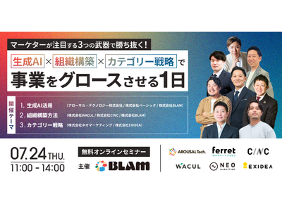 AI研修・コンサルティング・開発支援を行うアローサル・テクノロジー株式会社(本社:東京都港区、代表取締役:佐藤拓哉)は、2025年7月24日(木)に開催されるBLAM株式会社主催のオンラインカンファレンス「マーケターが注目する3つの武器で勝ち抜く!生成AI × 組織構築 × カテゴリー戦略で事業をグロースさせる1日」において、当社代表・佐藤拓哉が登壇いたします。
