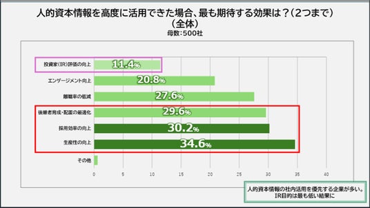 人的資本情報の活用によって企業が最も期待する効果は、「生産性の向上」(約35%)、「採用効率の向上」(約30%)、「後継者育成・配置の最適化」(約30%)がトップ3。一方で、「投資家からの評価向上」は約11%と最下位に留まる。