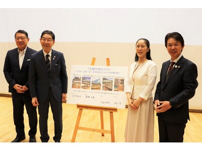 この日、「五館文学めぐり」事業発表及び署名式は、荒川区立ゆいの森あらかわ・ゆいの森ホールに、成澤廣修区長(文京区)、服部征夫区長(台東区)、やまだ加奈子区長(北区)、滝口学区長(荒川区)の4区長が一堂に会し開催されました。まず、荒川区のゆいの森課長岡村香織から「五館文学めぐり」の事業概要の紹介があり、続いて、各区長からご挨拶と各区の文学館の紹介がありました。その後、事業の成功を祈念して、各区の文学館が大きく描かれたボードに各区長の直筆のサインが施されました。