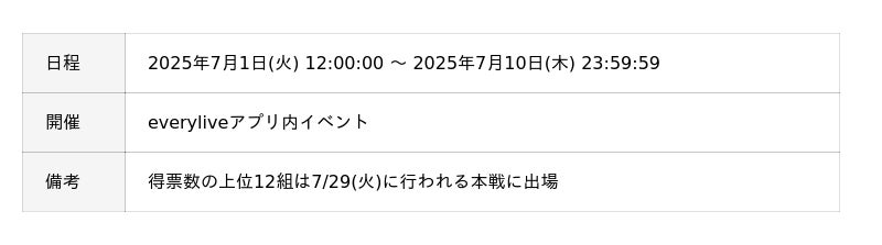当イベントは、everyliveアプリ内で予選イベントが行わることが特徴となり、アプリ内での投票によって決勝進出者が決定するシステムになります。