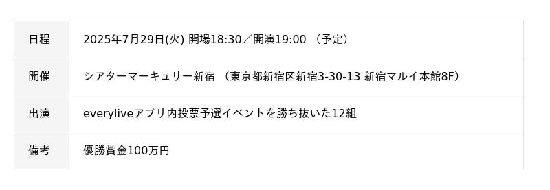 everyliveアプリ内で行われる投票イベントを勝ち上がった12組が決勝に駒を進め、賞金100万円をかけてしのぎを削ります。