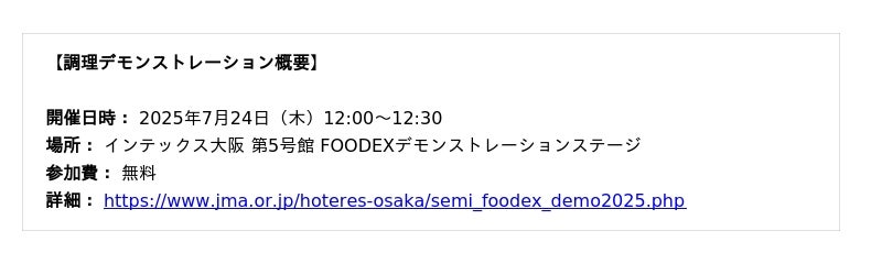 こうした背景のもと、7月23日(水)~25日(金)にインテックス大阪で開催される「ホテル・レストランショー&FOODEX JAPAN in 関西 2025」において、当法人(NPO法人ベジプロジェクトジャパン)は、動物性原材料不使用のヴィーガン・プラントベース商材を紹介する「ベジプロジェクト ゾーン」を展開します。さらに、7月24日(木)には、リーガロイヤルホテル大阪の倉員直樹シェフとのコラボレーションにより、ヴィーガンメニューの調理実演も開催します。