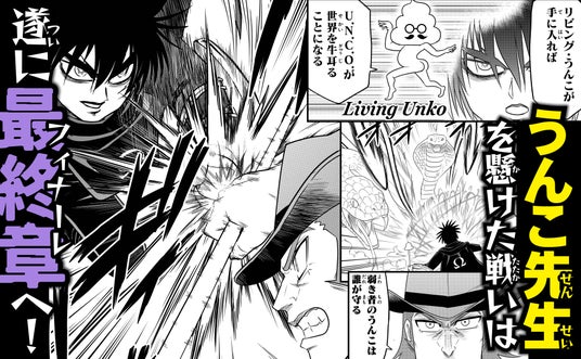 うんこ先生たちが見守る中、一刀斎とチョカカーの激闘は、誰も予想だにしなかった結末を迎え、「大爆決伍吽闘」はいよいよ「吽己紅羅泥衛闘」と呼ばれる最終戦へなだれ込む……!