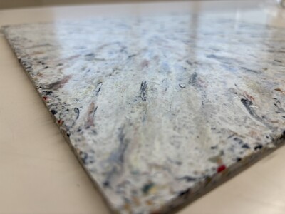 以下は今回プレス成形に成功した、あらゆる廃プラ由来の5mm薄型板材の実物写真です。