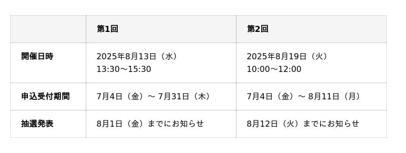 詳細・お申込みは、公式サイトをご覧ください。参加申込フォームに必要事項を記入し、期限内にお申込みください。応募者多数の場合は抽選で参加者を決定し、当選者にはメールでご連絡いたします。