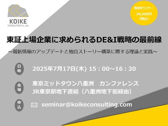 小池コンサルティング株式会社(所在地:東京都千代田区、代表取締役社長:小池陽二郎)は、2025年7月17日(木)に、特別セミナー『東証上場企業に求められるDE&I戦略の最前線~最新情報のアップデートと独自ストーリー構築に際する理論と実践~』を開催いたします。(