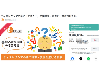 ディスレクシア支援団体の認定NPO法人エッジ(東京都港区 会長:藤堂栄子)は、ディスレクシアの子の味方・支援を広げるために、クラウドファンディング【ディスレクシアの子に「できた!」の笑顔を。あなたと共に広げたい】に50日間挑戦してまいりました。最終日の2025年6月30日には、270名もの皆さまから、目標金額300万円に対し123%達成の3,702,000円のご支援をいただき、クラウドファンディングを終了いたしました。