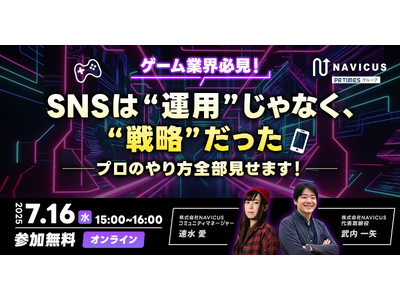 国内外のゲーム事業会社様のファンコミュニティ作りを、SNSを通じてご支援している株式会社NAVICUS(本社:東京都千代田区、代表取締役:武内 一矢、以下「NAVICUS」)が、ゲーム業界のマーケティング担当者やプロデューサーの方々を対象とした無料のウェビナー「ゲーム業界必見! SNSは“運用”じゃなく、“戦略”だった──プロのやり方全部見せます!」を2025年7月16日(水)に開催します。