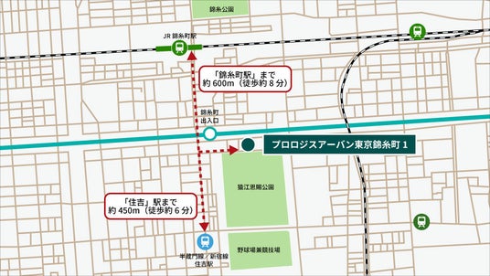 開発地は、JR総武線「錦糸町」駅から約600m(徒歩約8分)、東京メトロ半蔵門線・都営新宿線「住吉」駅から約450m(徒歩約6分)で、通勤利便性が高く、周辺には多くのオフィスが隣接する立地です。