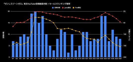 LIVEOPSIS/『ゼンレスゾーンゼロ』ゲーム実況YouTuberの新規投稿本数×ランキング推移(6月)