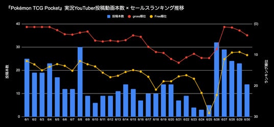 LIVEOPSIS/『Pokemon TCG Pocket』ゲーム実況YouTuberの新規投稿本数×ランキング推移(6月)