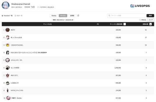 このランキングは運営ソリューション『LIVEOPSIS』にて提供する機能の1つで、会員は日・週・月単位でゲーム実況YouTuberが配信するスマホゲームタイトルや投稿内容、視聴回数推移など動画のトレンドを随時把握することができます。11位以下のランキング及び詳細データをご希望の企業ご担当者様はLIVEOPSISからお問い合わせください。