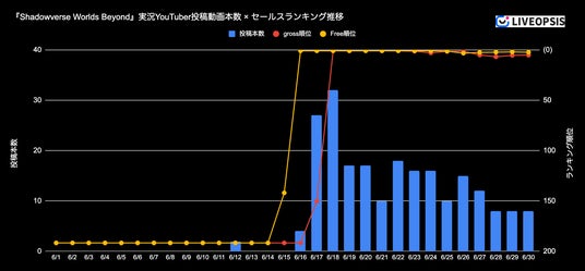 LIVEOPSIS/『Shadowverse: Worlds Beyond』ゲーム実況YouTuberの新規投稿本数×ランキング推移(6月)
