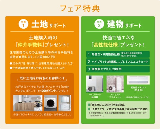 全国先着50棟限定で開催いたします。土地から住まいづくりをお考えのご家族を、土地購入サポートと住まいの性能アップの両面から応援するお得な特典をプレゼントいたします。