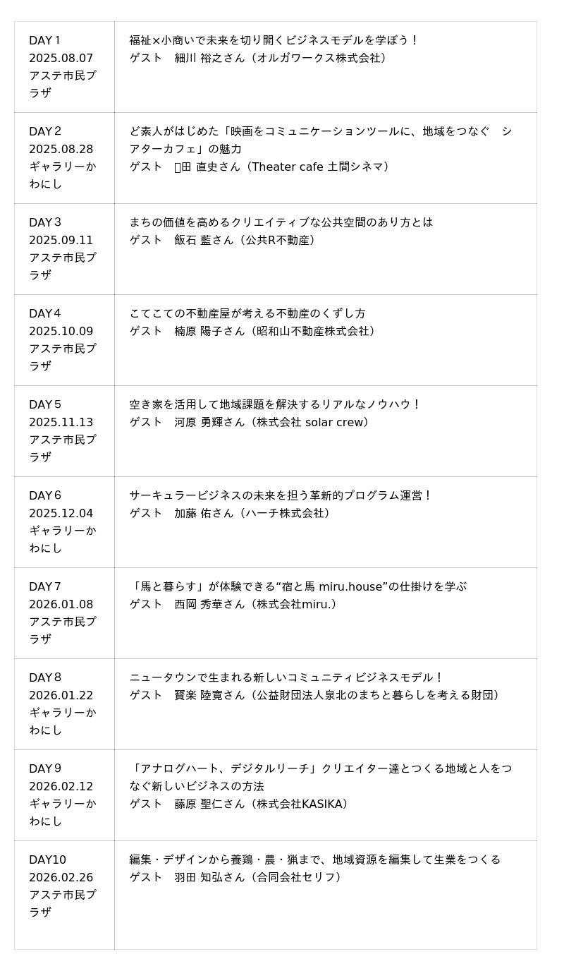 この場で交わされる言葉やアイデア、想いから生まれた変化の種を、参加者がそれぞれの現場に持ち帰り、やがて“まちを動かす力”へと つながっていくことをめざします。