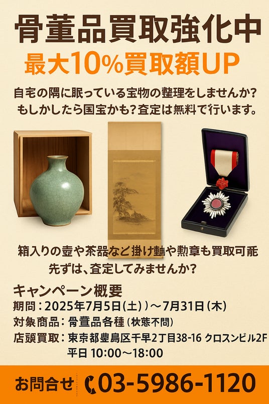 株式会社クロスワン(本社:東京都豊島区、代表取締役:品川あきら)が運営する「クロスワン・リユース事業部」および「おたからや千川駅前店」では、2025年7月5日(土)から7月31日(木)までの期間、骨董品買取額が最大10%アップするキャンペーンを実施中です。
