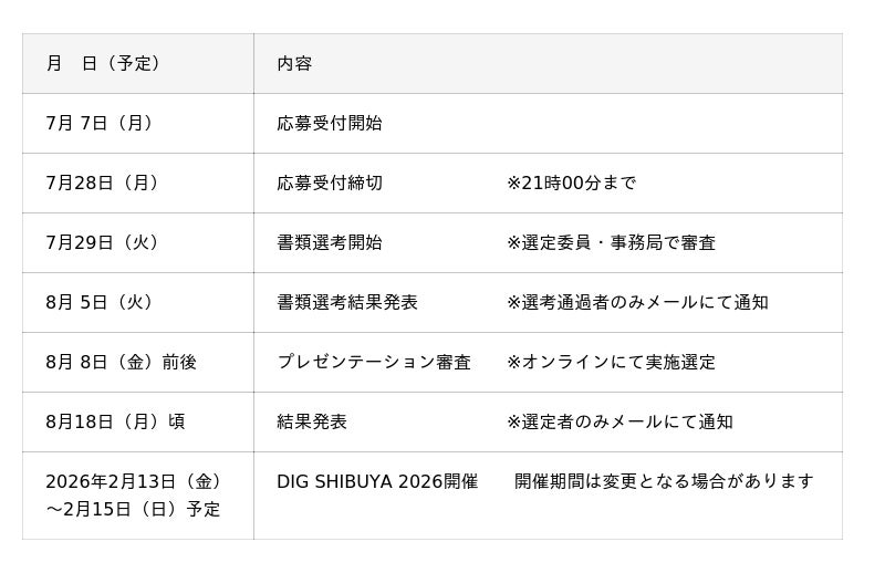 DIG SHIBUYA 2026の連携プロジェクトとして実施を希望する、テクノロジー、アート、カルチャー分野におけるオリジナルの展示企画やイベント企画を募集します。選考のうえご参加いただくこととなった皆様には、プロジェクト展示などを同時期に開催できるよう、開催会場となるベニュー、上限30万円(税別)の運営費用の提供も予定しております。参画をご希望されるコミュニティ、団体、企業の皆様は、以下詳細をご確認の上、連携プロジェクト募集フォームよりご応募ください。