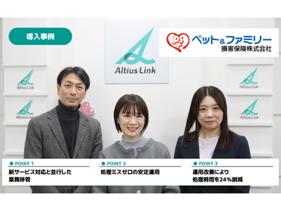 アルティウスリンク株式会社(所在地:東京都渋谷区、代表取締役社長:若槻 肇、以下 アルティウスリンク)は、ペット&ファミリー損害保険株式会社(所在地:東京都台東区、代表取締役社長:石井 淳二郎、以下 ペット&ファミリー損保)の海外拠点からのバックオフィス業務を移管する中で、高い品質の維持と業務効率化を実現した好事例を公開しました。同時期に開始した新規業務と並行して移管を行い、処理ミスゼロの安定運用と処理時間の24%削減につなげました。