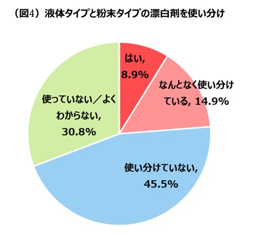 液体タイプと粉末タイプの漂白剤を「使い分けている」か、との問いに、“使い分けている”と回答した人は23.8%(「はい」8.9%+「なんとなく使い分けている」14.9%)(図4)。この層の中では、「液体タイプは日常の洗濯に」「粉末タイプは頑固汚れや週末のつけおきに」と、用途別に賢く使い分ける“スイッチ漂白”が、すでに一定層のユーザーに定着しており、それぞれ51.8%と51.0%と過半数が実践しています(表1)。