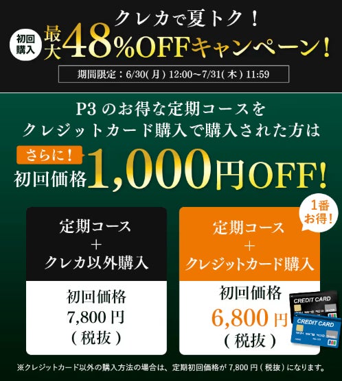 クレジットカード決済でP3が1,000円OFF!初回最大48%OFFの定期コース登場!