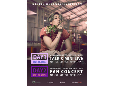 今回は「2025 HAN SEUNG WOO SUMMER PARTY」と題し、8月9日は「th MINI ALBUM [TOP NOTE] リリーズ記念 TALK & MINI LIVE」で新曲の披露やトークショー、そして8月10日はファンクラブのオープンを記念し、「JAPAN OFFICIAL FANCLUB HAN_A オープン記念 FAN CONCERT」として、さまざまなパフォーマンスやスペシャルなイベントでファンと楽しむ。