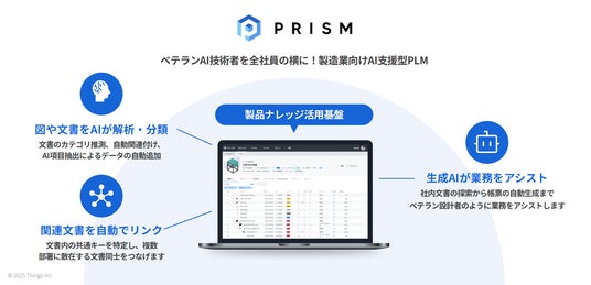 Thingsは2021年9月に設立され、社内に散在する技術情報を一元化・利活用できる製品ナレッジ活用クラウド「PRISM(プリズム)」の開発を開始しました。2023年5月の正式版リリース以降、国内初のSaaSネイティブなPLMとして初心者でも直感的に操作できるシンプルなUIや、導入コストを半分以下に抑えられる柔軟なカスタマイズ性をご評価いただき、導入企業数は着実に拡大しています。