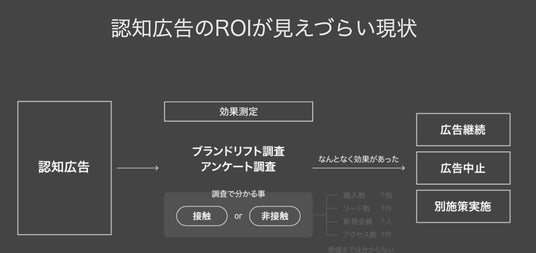 現在、認知広告の効果は主にブランドリフト調査やアンケート調査で評価されていますが、購入数やリード数などの具体的な成果に基づく分析が困難であるため、広告投資の有効性や次の投資先の選定が不透明です。この課題を解決するため、bfjは認知広告の効果を事業KPIに近い指標で正確に可視化できる手法を開発しました。