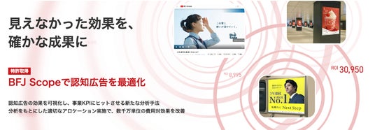 bfjは、上記特許の取得を経て、この独自分析手法を基盤とした新たなサービス『BFJ Scope』の提供を正式に開始いたしました。BFJ Scopeは、認知広告の真の成果を事業KPIに直結させて可視化し、企業の広告投資のROI最大化と成長を強力にサポートするサービスです。