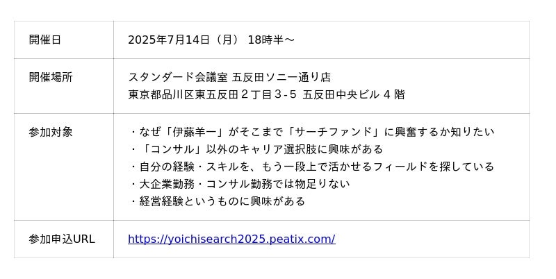 田中氏のように、“大企業×コンサル×MBA”というバックグラウンドを持つ人材が、あえて中小企業の承継を選ぶ理由とは何か?そのリアルを語るイベントを、2025年7月14日(月)に開催します。特別ゲストには、次世代リーダーを育成する第一人者伊藤羊一氏(武蔵野大学アントレプレナーシップ学部長)を迎え、本ファンド投資責任者・吉沢康弘、本ファンドから出資したサーチャーと、コンサル、商社といった事業会社で活躍しているビジネスパーソンとともに、サーチファンドというキャリアの“実像”と“可能性”に迫ります。
