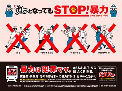 日本民営鉄道協会、JR北海道、JR東日本、JR東海、JR西日本、JR四国、JR九州、 札幌市交通局、東京都交通局、横浜市交通局、名古屋市交通局、福岡市交通局、ニューシャトル、 北総鉄道、東京モノレール、ゆりかもめ、多摩都市モノレール、東京臨海高速鉄道、横浜シーサイドライン、愛知環状鉄道、名古屋臨海高速鉄道、Osaka Metroでは、この度、共同で「暴力行為防止ポスター『カッとなっても STOP!暴力』」を制作し、2025年7月11日(金)から、各鉄道事業者の駅構内、列車内に掲出いたします。