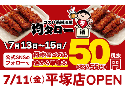 平塚店の新規開店を記念し7月13日(日)より3日間、名物「金から串」を1本50円(税込55円)のオープニングキャンペーンを開催します。コスパよく豊富なメニューを楽しめる、いつもの日常がもっと楽しくなる激安コスパ系居酒屋・均タロー 平塚店へぜひお越しください!
