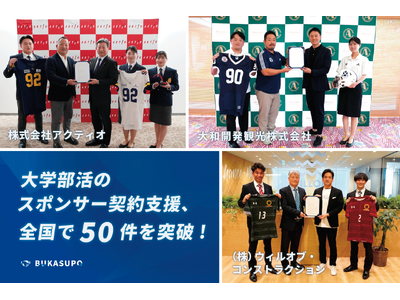 大学部活と企業をつなぐスポンサーマッチングサイト『BUKASUPO(ブカスポ)』を運営する株式会社部活メディア(本社:東京都千代田区)は、このたび、ブカスポを通じて全国50の大学部活動とのスポンサー契約を達成しました。