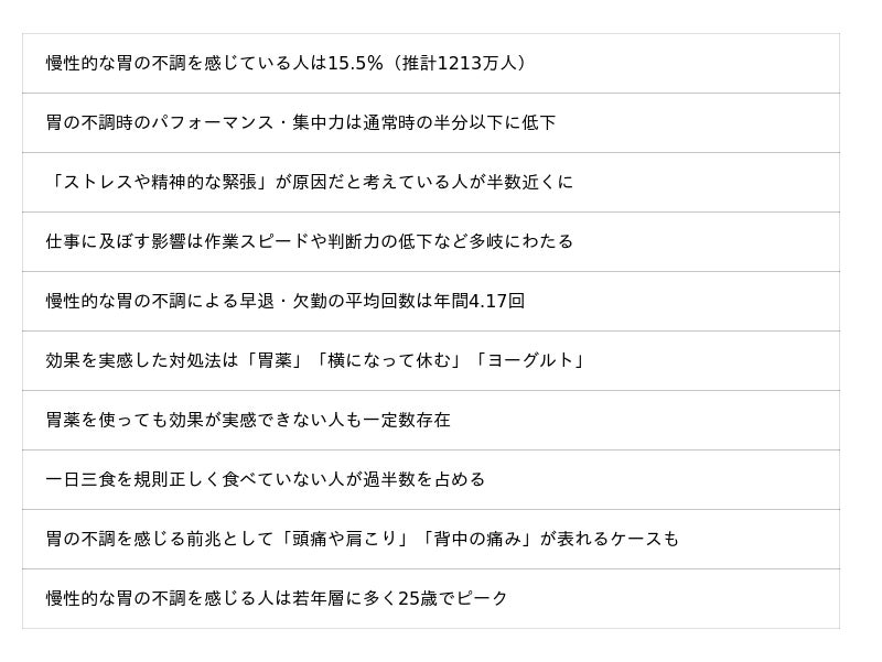 ・10人に1人が胃の不調によって欠勤・早退した経験があると回答
