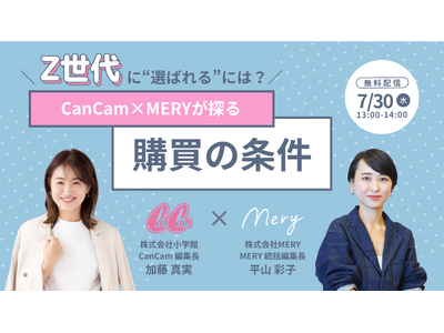 株式会社MERY(本社:東京都千代田区、代表取締役社長:藤田 欣司)は、株式会社小学館(本社:東京都千代田区、代表取締役社長:相賀 信宏)とともに、若年層向けブランドのマーケティング担当者向けに「Z世代に"選ばれる"には?CanCam×MERYが探る「購買の条件」と題したウェビナーを開催します。