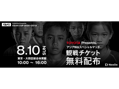 Now Do株式会社(所在地:東京都新宿区、代表取締役:本田圭佑)は、8月10日(日)に大田区総合体育館(東京都大田区)で開催する、4v4史上初となる国際大会「TOYOTA Presents, 4v4 ASIAN CUP 2024-25」(以下、本大会)の一般観戦チケットの「無料」配布を行うことをお知らせいたします。