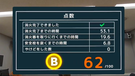 個別開発は一切必要ありません。出火場所、延焼範囲、消火器の設置場所は、実際の環境にあわせて自由に設定できる他、粉末消火器の粉末飛散を体験できるリアルパウダーモードなど、様々な演出の設定も可能です。体験後は、プレイ内容をAIで判定し、スコア表示、コメント表示を行います。