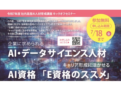 また、これに先立ち、静岡県内の企業にお勤めの方を対象に「企業に求められるAI・データサイエンス人材」(東京科学大学情報理工学院情報工学系教授:岡崎直観氏)と「キャリア形成に活かせるAI資格E資格のススメ」(日本ディープラーニング協会専務理事:岡田隆太朗氏)と題した2つのオンラインセミナーを無料でご提供します。