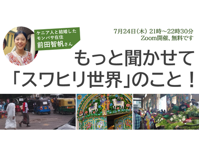 今回のイベントでは、“スワヒリ都市”の異名をもつケニア沿岸部のモンバサでケニア人の夫と暮らす前田智帆さんに登壇していただき、スワヒリ文化の魅力をはじめ、途上国を専門とするNPOメディア「