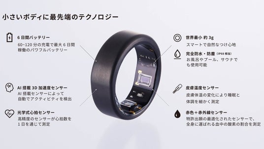 SOXAI社が提供する健康管理用スマートリング「SOXAI RING」は、世界最小※1の幅7.6mm・厚み2.5mm・約3gの筐体に、光学バイタルセンサーや温度センサー、加速度センサーなどを搭載し、睡眠の質や消費カロリーなどの活動量、心拍変動などの体調パフォーマンスを測定します。※2