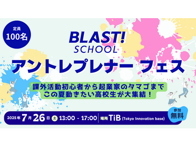 2025年7月26日(土)、高校生向け起業家育成プログラムを展開する一般社団法人留学エール(以下 BLAST! SCHOOL)は、課外活動や起業に挑戦したい高校生のための夏の特別イベント「アントレプレナーフェス~課外活動初心者から起業家のタマゴまで この夏動きたい高校生が大集結!~」をTiB(Tokyo Innovation Base)にて開催します。