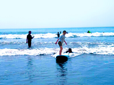 参加者は学年や経験に応じてグループ分けされ、まずは陸上で立ち上がりのフォームを練習。その後、順番に海へ入り、実際の波乗りに挑戦しました。