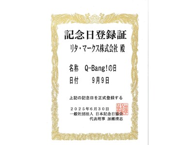 アミューズメント事業、飲食事業を展開するリタ・マークス株式会社(本社:大阪府大阪市、代表取締役:大原泰裕)は、同社が運営するパチンコホール「Q-Bang!(キューバン)」にちなみ、9月9日を「Q-Bang!の日」として、一般社団法人日本記念日協会より記念日として正式に登録認定されましたことをお知らせします。