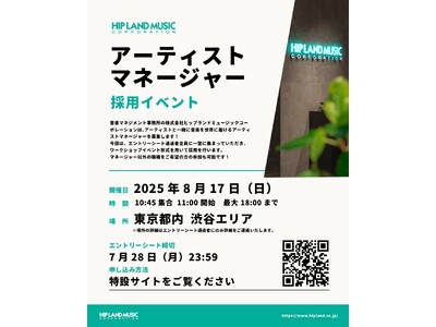音楽マネジメント事務所の株式会社ヒップランドミュージックコーポレーション(本社:東京都港区、代表取締役:野村達矢)は、アーティストマネジメント職を中心にスタッフを募集いたします。