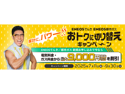 7月11日(金)から9月30日(火)までの間、「ENEOSでんき」と「ENEOS都市ガス」の「家計にパワー!! おトクに切り替えキャンペーン」※1(以下、本キャンペーン)を実施しますので、お知らせいたします。