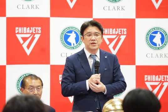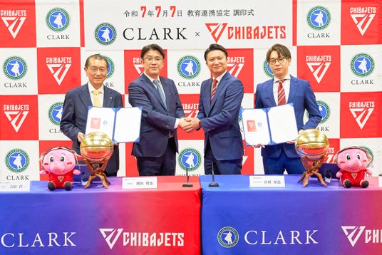 千葉ジェッツふなばしとクラーク国際の調印式の様子