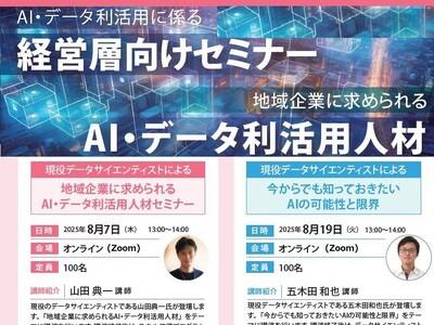 また、これに先立ち、茨城県内の企業にお勤めの方・個人事業主の方および個人の方を対象に「地域企業に求められるAI・データ利活用人材セミナー」(山田 典一氏)と「今からでも知っておきたいAIの可能性と限界」(五木田 和也氏)と題した2つのオンラインセミナーを無料でご提供します。