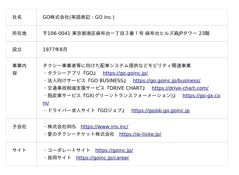 GO株式会社(本社:東京都港区、代表取締役社長:中島 宏)が展開する
