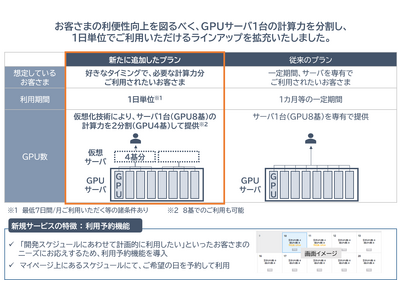 こうしたニーズにお応えするため、仮想化技術※4によりGPUサーバ1台の計算力を分割し、1日単位でご利用いただけるプランをラインアップに追加したものです。また、より計画的な利用を支援するため、GPUサーバの利用予約機能※5も導入しております。
