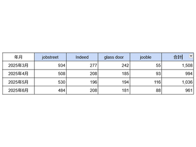 主要4サイト別の掲載数としては、「jobstreet」が484件、「Indeed」が208件、「glass door」が181件、「jooble」が88件となり、複数の求人サイトで900件の推移を保つ求人募集が行われています。
