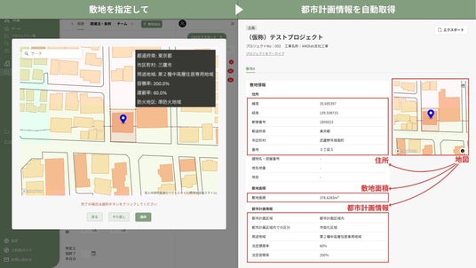 国土地理院最適化ベクトルタイルを利用した地図と、国土交通省の不動産情報ライブラリから取得できる都市計画情報により、敷地に関する情報調査の時間を大幅に短縮できます。